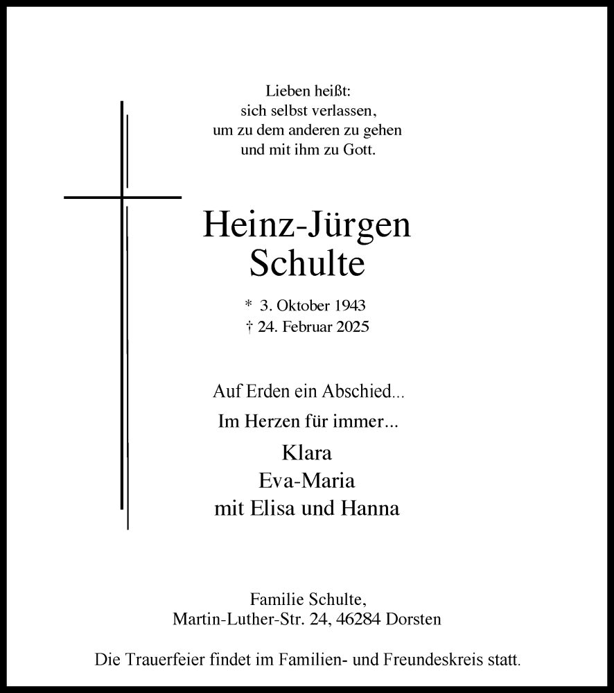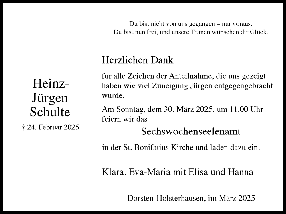 Hier finden Sie alle Traueranzeigen aus der Zeitung, die bisher für Heinz-Jürgen Schulte erschienen sind. Weitere Traueranzeigen, die in der Zeitung erscheinen, werden hier ebenfalls aufgelistet