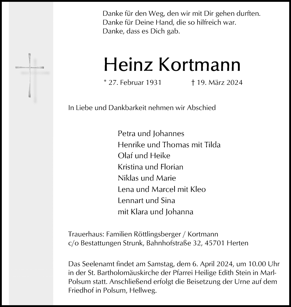 Hier finden Sie alle Traueranzeigen aus der Zeitung, die bisher für Heinz Kortmann erschienen sind. Weitere Traueranzeigen, die in der Zeitung erscheinen, werden hier ebenfalls aufgelistet