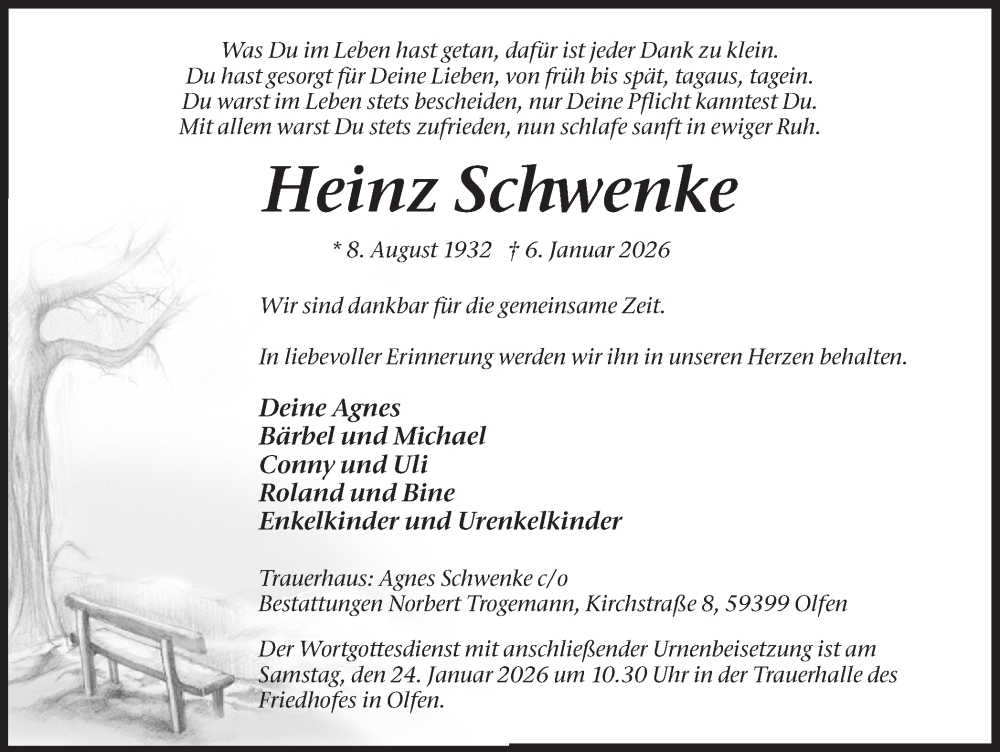 Hier finden Sie alle Traueranzeigen aus der Zeitung, die bisher für Heinz Schwenke erschienen sind. Weitere Traueranzeigen, die in der Zeitung erscheinen, werden hier ebenfalls aufgelistet