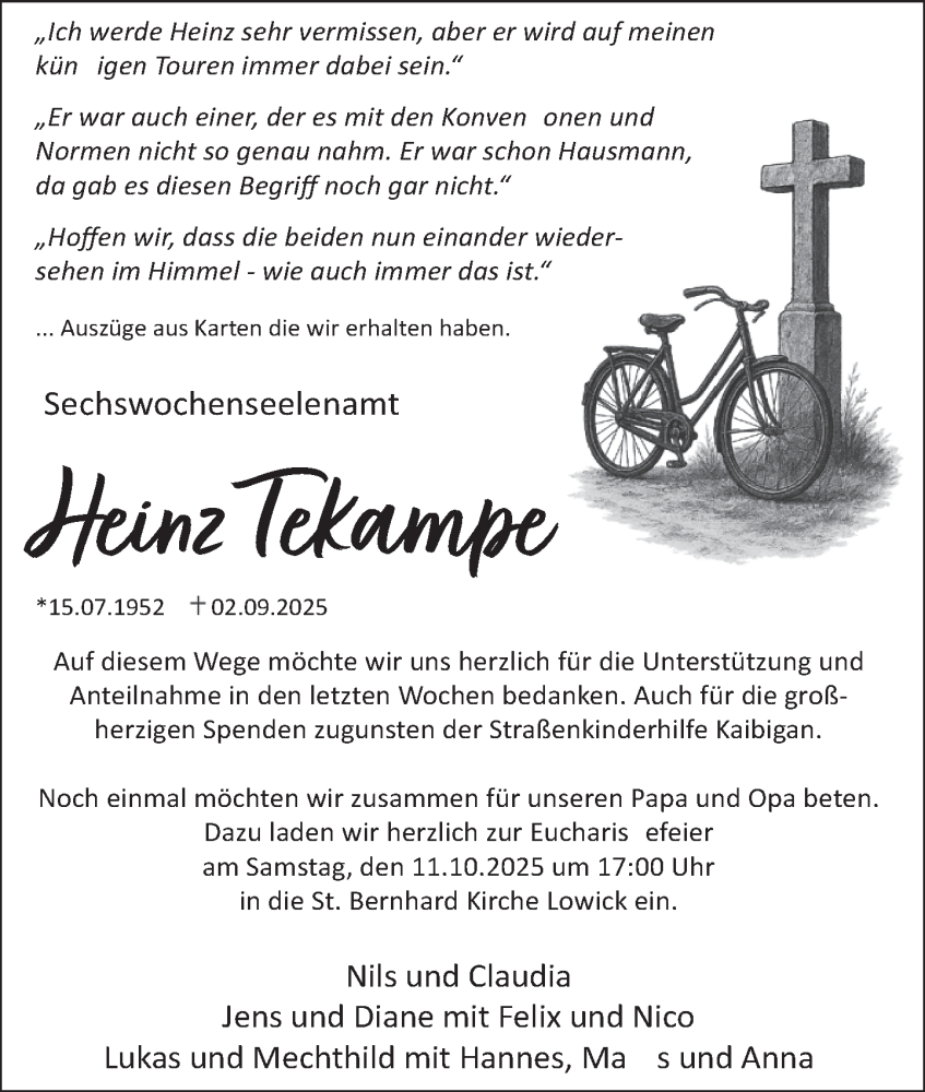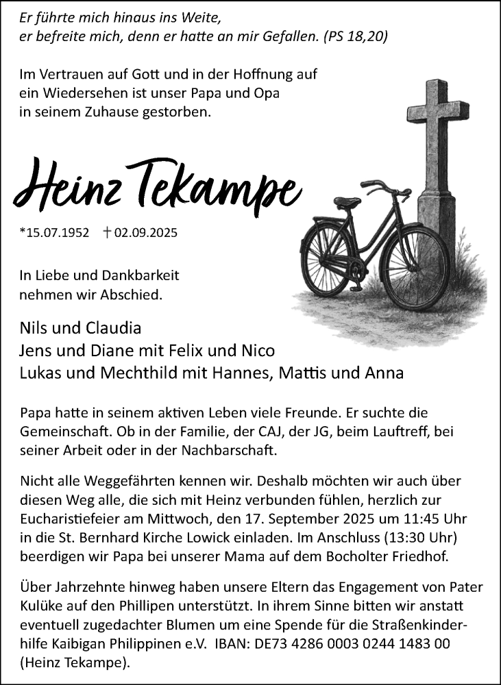 Hier finden Sie alle Traueranzeigen aus der Zeitung, die bisher für Heinz Tekampe erschienen sind. Weitere Traueranzeigen, die in der Zeitung erscheinen, werden hier ebenfalls aufgelistet