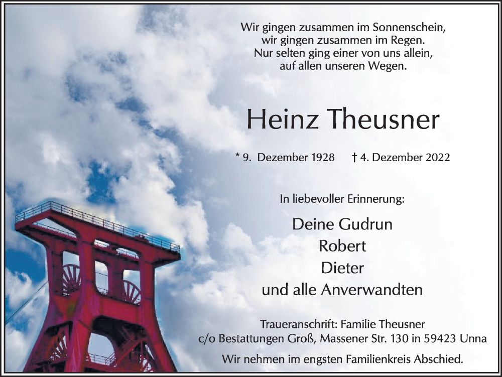 Hier finden Sie alle Traueranzeigen aus der Zeitung, die bisher für Heinz Theusner erschienen sind. Weitere Traueranzeigen, die in der Zeitung erscheinen, werden hier ebenfalls aufgelistet