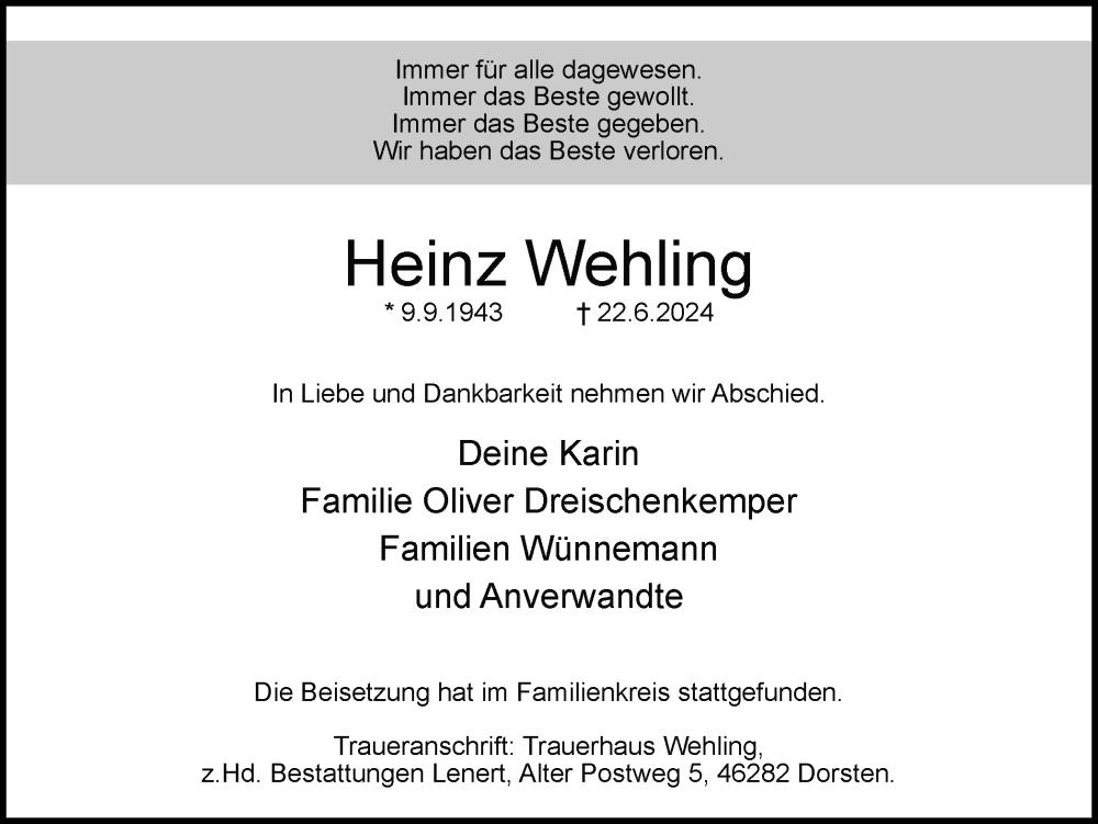 Hier finden Sie alle Traueranzeigen aus der Zeitung, die bisher für Heinz Wehling erschienen sind. Weitere Traueranzeigen, die in der Zeitung erscheinen, werden hier ebenfalls aufgelistet