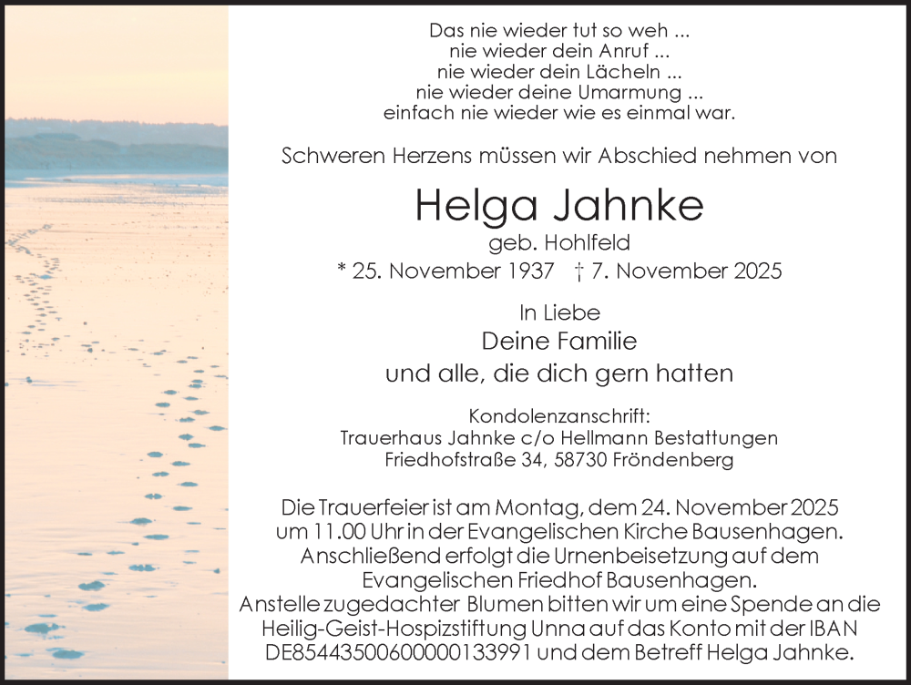 Hier finden Sie alle Traueranzeigen aus der Zeitung, die bisher für Helga Jahnke erschienen sind. Weitere Traueranzeigen, die in der Zeitung erscheinen, werden hier ebenfalls aufgelistet