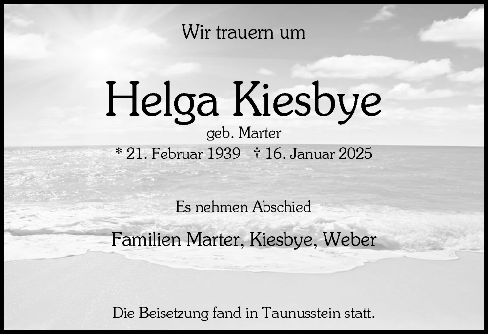 Hier finden Sie alle Traueranzeigen aus der Zeitung, die bisher für Helga Kiesbye erschienen sind. Weitere Traueranzeigen, die in der Zeitung erscheinen, werden hier ebenfalls aufgelistet