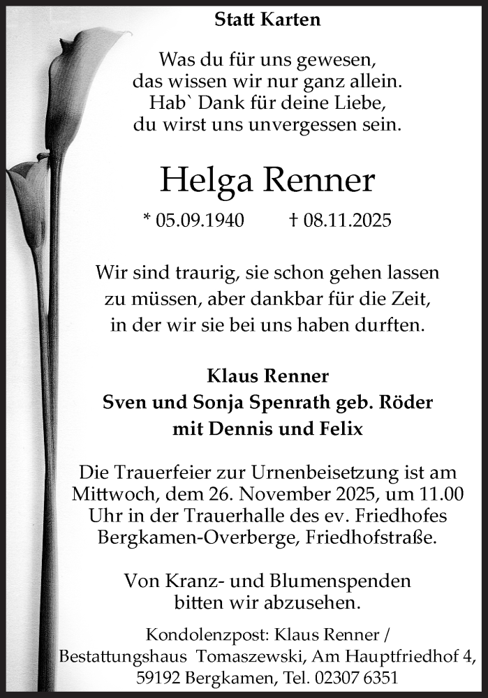Hier finden Sie alle Traueranzeigen aus der Zeitung, die bisher für Helga Renner erschienen sind. Weitere Traueranzeigen, die in der Zeitung erscheinen, werden hier ebenfalls aufgelistet