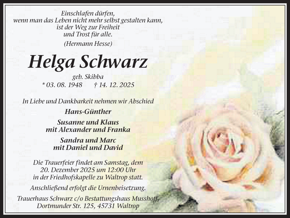 Hier finden Sie alle Traueranzeigen aus der Zeitung, die bisher für Helga Schwarz erschienen sind. Weitere Traueranzeigen, die in der Zeitung erscheinen, werden hier ebenfalls aufgelistet
