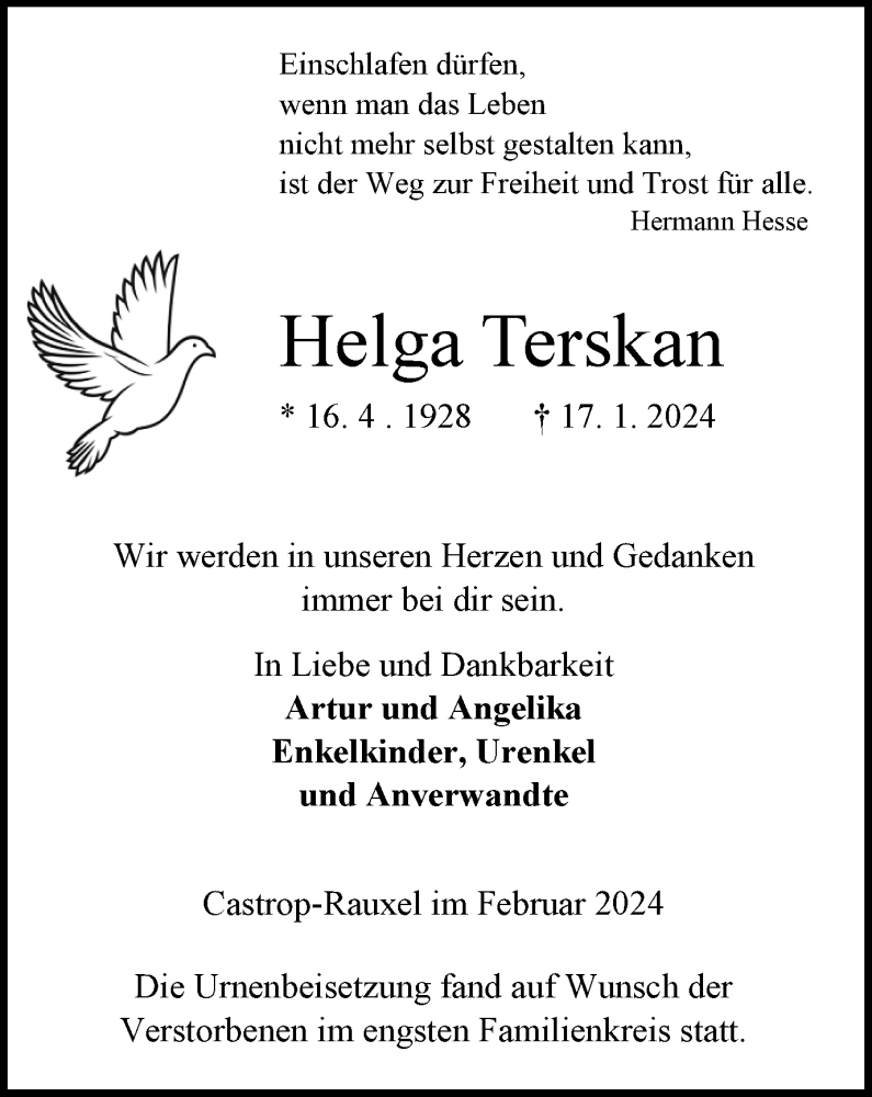 Hier finden Sie alle Traueranzeigen aus der Zeitung, die bisher für Helga Terskan erschienen sind. Weitere Traueranzeigen, die in der Zeitung erscheinen, werden hier ebenfalls aufgelistet
