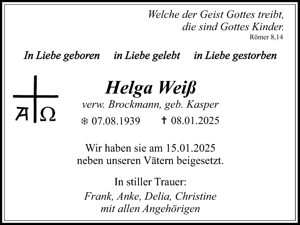 Hier finden Sie alle Traueranzeigen aus der Zeitung, die bisher für Helga Weiß erschienen sind. Weitere Traueranzeigen, die in der Zeitung erscheinen, werden hier ebenfalls aufgelistet