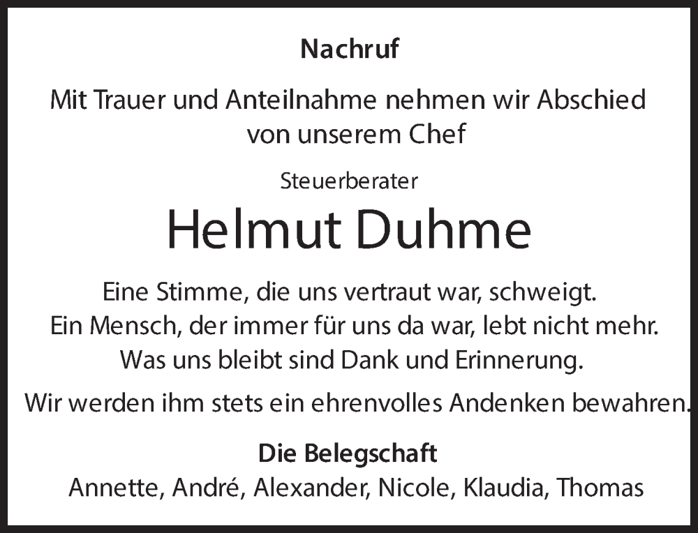 Hier finden Sie alle Traueranzeigen aus der Zeitung, die bisher für Helmut Duhme erschienen sind. Weitere Traueranzeigen, die in der Zeitung erscheinen, werden hier ebenfalls aufgelistet