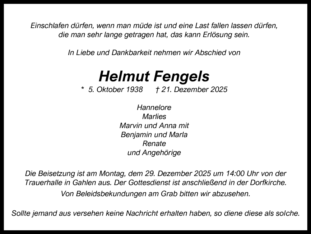 Hier finden Sie alle Traueranzeigen aus der Zeitung, die bisher für Helmut Fengels erschienen sind. Weitere Traueranzeigen, die in der Zeitung erscheinen, werden hier ebenfalls aufgelistet