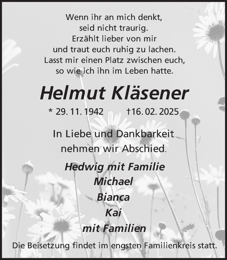 Hier finden Sie alle Traueranzeigen aus der Zeitung, die bisher für Helmut Kläsener erschienen sind. Weitere Traueranzeigen, die in der Zeitung erscheinen, werden hier ebenfalls aufgelistet