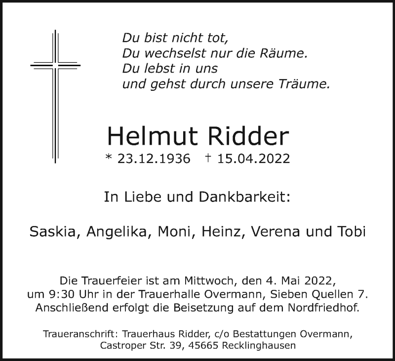 Hier finden Sie alle Traueranzeigen aus der Zeitung, die bisher für Helmut Ridder erschienen sind. Weitere Traueranzeigen, die in der Zeitung erscheinen, werden hier ebenfalls aufgelistet