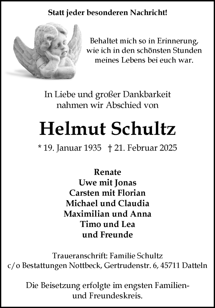 Hier finden Sie alle Traueranzeigen aus der Zeitung, die bisher für Helmut Schultz erschienen sind. Weitere Traueranzeigen, die in der Zeitung erscheinen, werden hier ebenfalls aufgelistet
