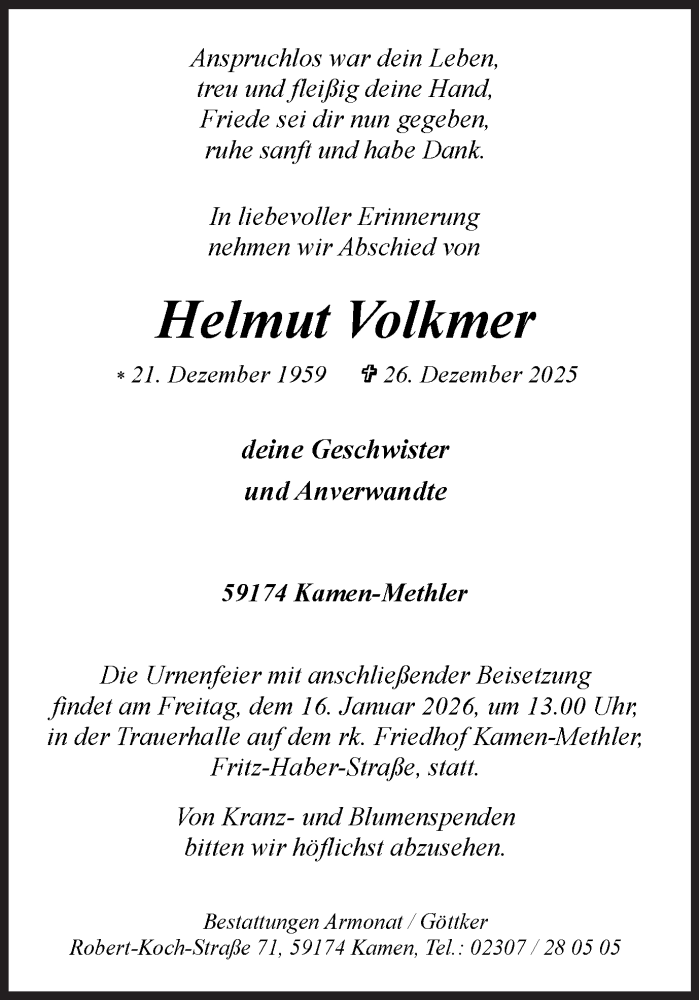 Hier finden Sie alle Traueranzeigen aus der Zeitung, die bisher für Helmut Volkmer erschienen sind. Weitere Traueranzeigen, die in der Zeitung erscheinen, werden hier ebenfalls aufgelistet