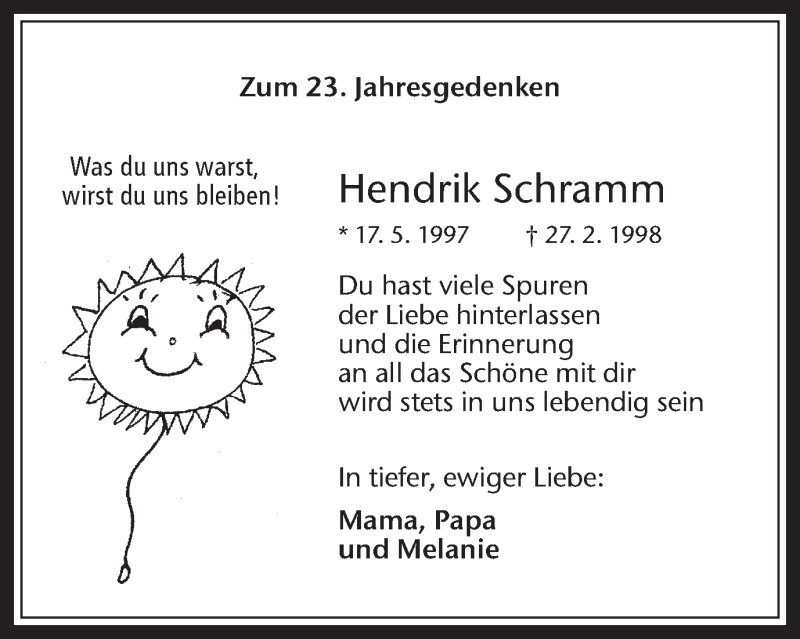 Hier finden Sie alle Traueranzeigen aus der Zeitung, die bisher für Hendrik Schramm erschienen sind. Weitere Traueranzeigen, die in der Zeitung erscheinen, werden hier ebenfalls aufgelistet