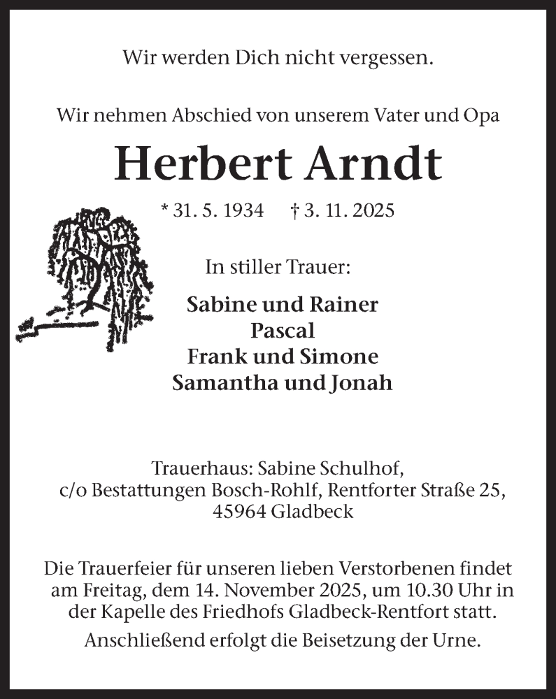 Hier finden Sie alle Traueranzeigen aus der Zeitung, die bisher für Herbert Arndt erschienen sind. Weitere Traueranzeigen, die in der Zeitung erscheinen, werden hier ebenfalls aufgelistet