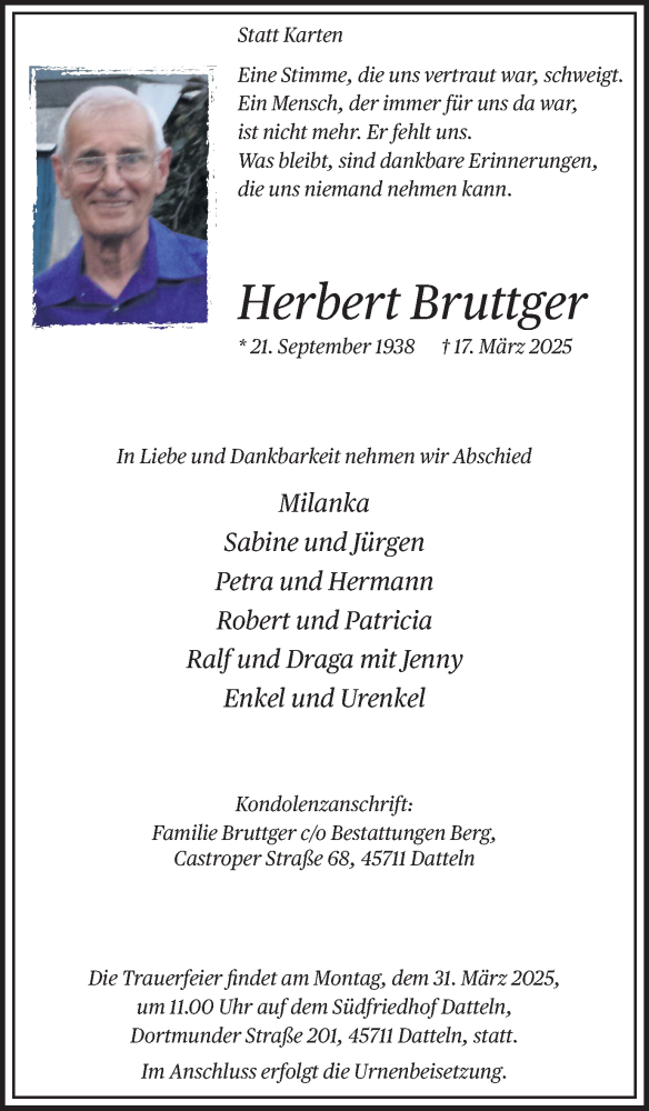 Hier finden Sie alle Traueranzeigen aus der Zeitung, die bisher für Herbert Bruttger erschienen sind. Weitere Traueranzeigen, die in der Zeitung erscheinen, werden hier ebenfalls aufgelistet