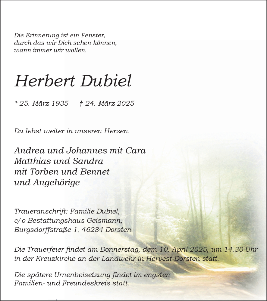 Hier finden Sie alle Traueranzeigen aus der Zeitung, die bisher für Herbert Dubiel erschienen sind. Weitere Traueranzeigen, die in der Zeitung erscheinen, werden hier ebenfalls aufgelistet