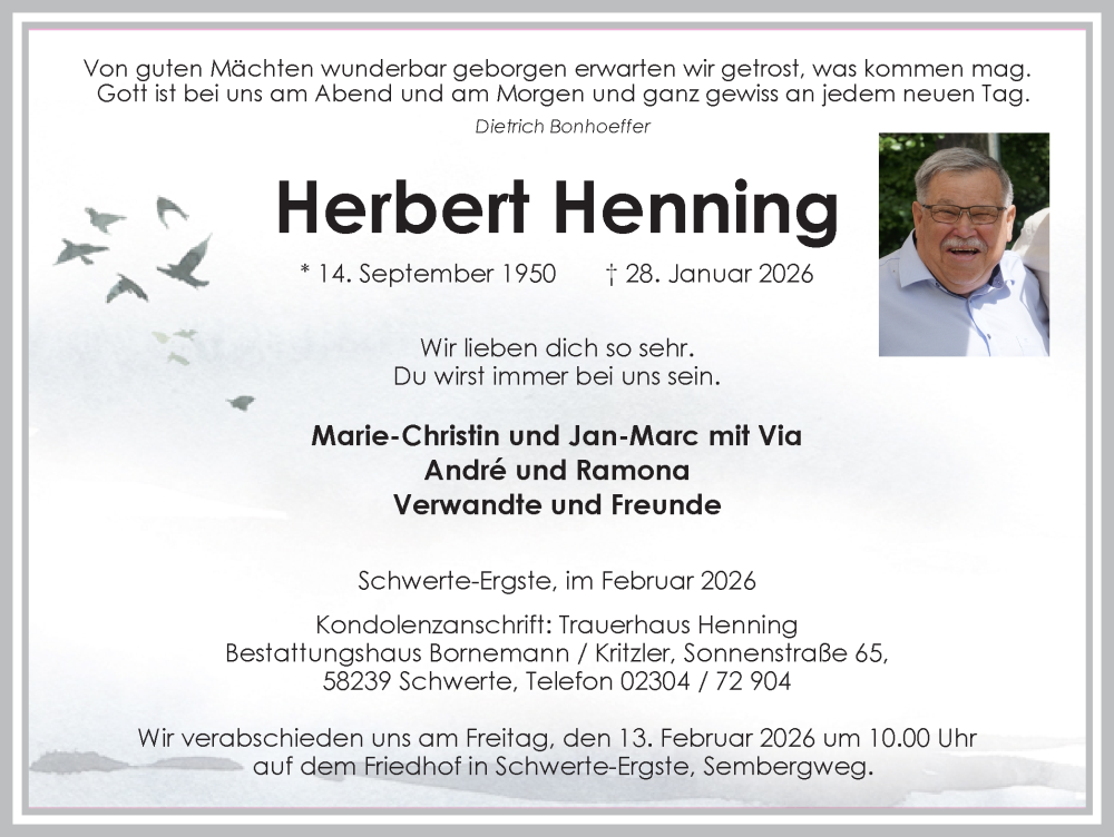 Hier finden Sie alle Traueranzeigen aus der Zeitung, die bisher für Herbert Henning erschienen sind. Weitere Traueranzeigen, die in der Zeitung erscheinen, werden hier ebenfalls aufgelistet