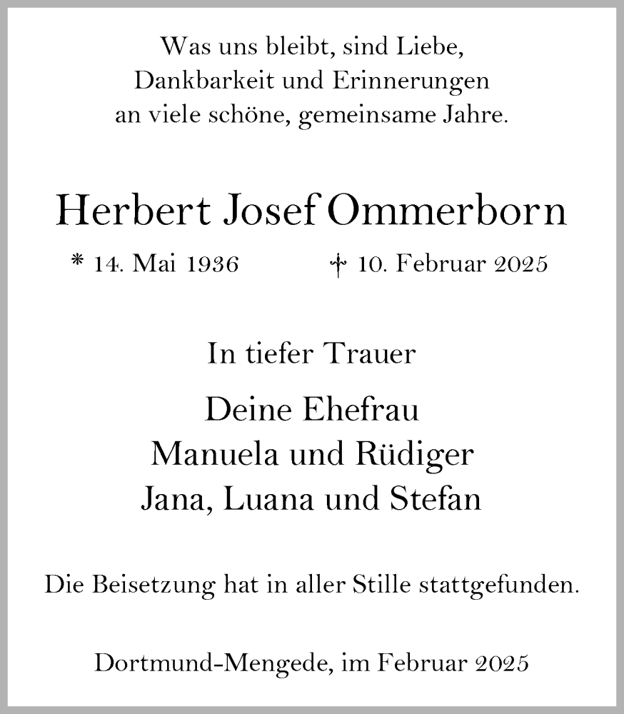 Hier finden Sie alle Traueranzeigen aus der Zeitung, die bisher für Herbert Josef Ommerborn erschienen sind. Weitere Traueranzeigen, die in der Zeitung erscheinen, werden hier ebenfalls aufgelistet