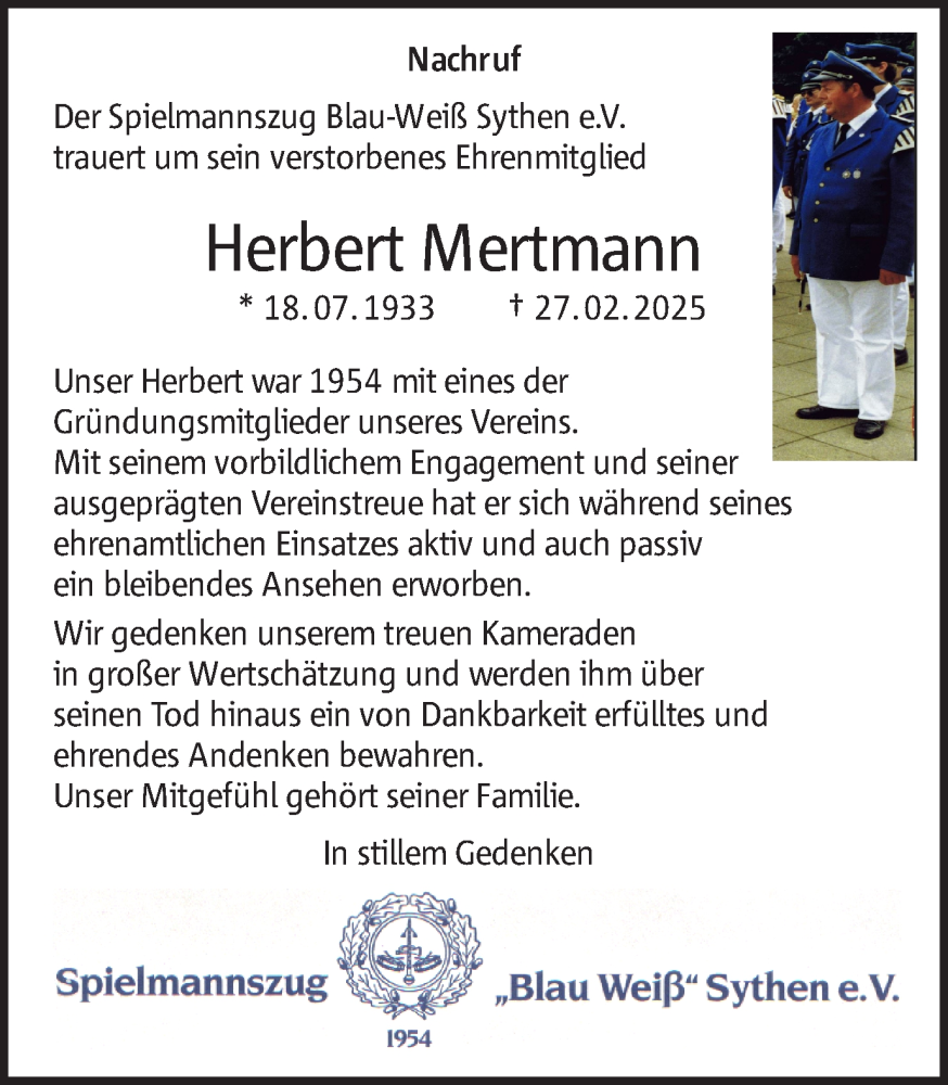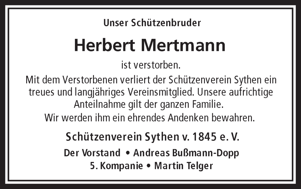 Hier finden Sie alle Traueranzeigen aus der Zeitung, die bisher für Herbert Mertmann erschienen sind. Weitere Traueranzeigen, die in der Zeitung erscheinen, werden hier ebenfalls aufgelistet