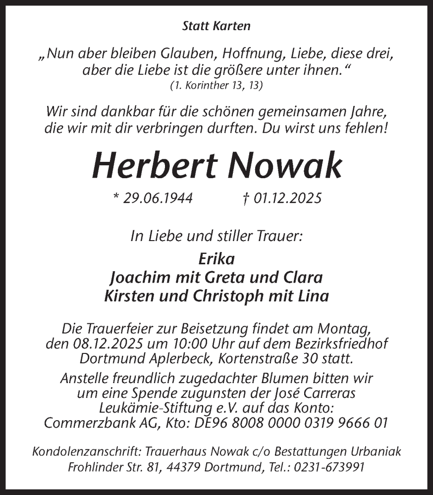 Hier finden Sie alle Traueranzeigen aus der Zeitung, die bisher für Herbert Nowak erschienen sind. Weitere Traueranzeigen, die in der Zeitung erscheinen, werden hier ebenfalls aufgelistet
