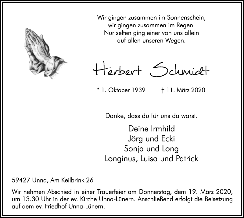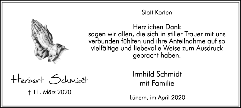 Hier finden Sie alle Traueranzeigen aus der Zeitung, die bisher für Herbert Schmidt erschienen sind. Weitere Traueranzeigen, die in der Zeitung erscheinen, werden hier ebenfalls aufgelistet