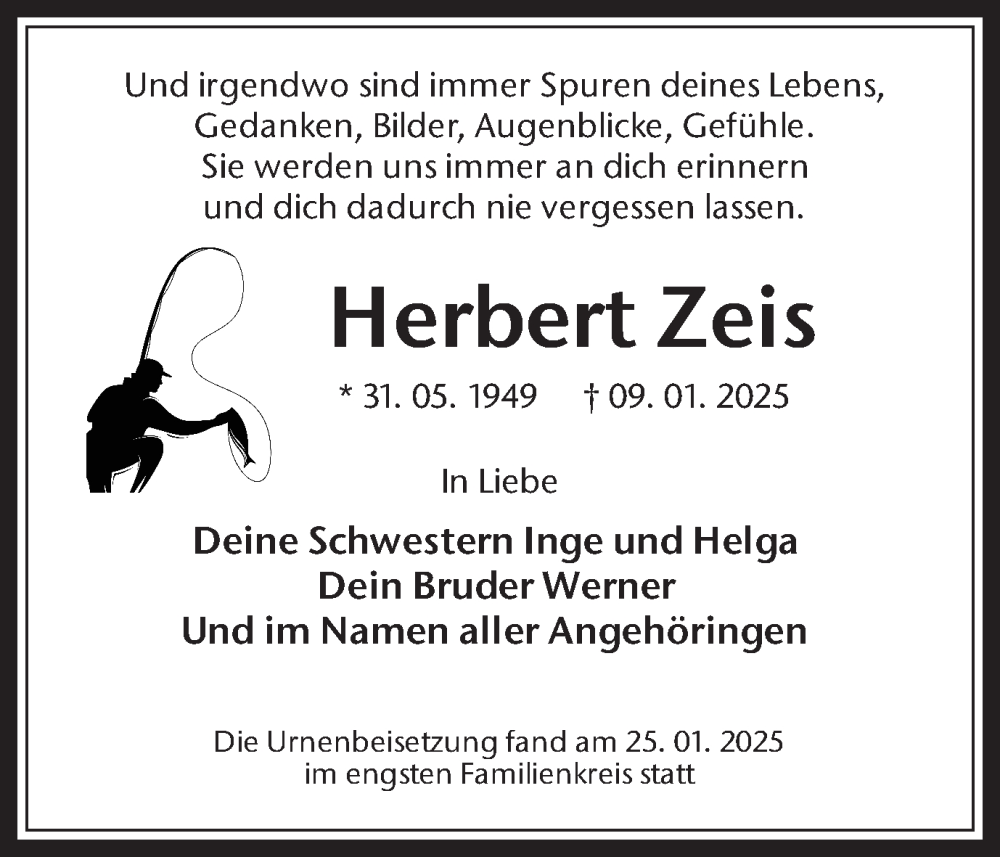 Hier finden Sie alle Traueranzeigen aus der Zeitung, die bisher für Herbert Zeis erschienen sind. Weitere Traueranzeigen, die in der Zeitung erscheinen, werden hier ebenfalls aufgelistet