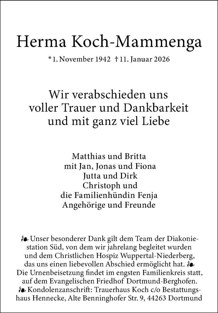 Hier finden Sie alle Traueranzeigen aus der Zeitung, die bisher für Herma Koch-Mammenga erschienen sind. Weitere Traueranzeigen, die in der Zeitung erscheinen, werden hier ebenfalls aufgelistet