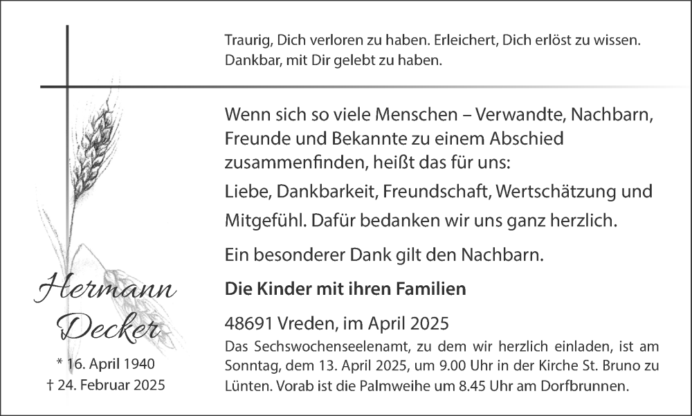 Hier finden Sie alle Traueranzeigen aus der Zeitung, die bisher für Hermann Decker erschienen sind. Weitere Traueranzeigen, die in der Zeitung erscheinen, werden hier ebenfalls aufgelistet