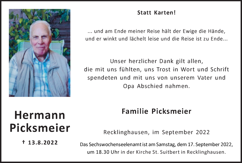 Hier finden Sie alle Traueranzeigen aus der Zeitung, die bisher für Hermann Picksmeier erschienen sind. Weitere Traueranzeigen, die in der Zeitung erscheinen, werden hier ebenfalls aufgelistet