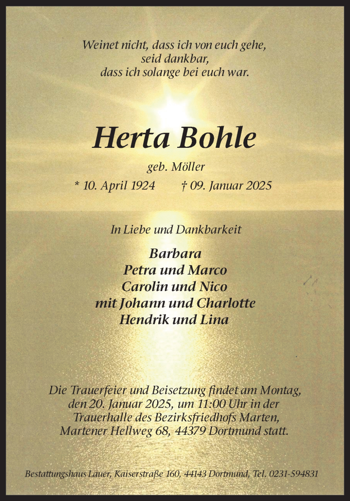Hier finden Sie alle Traueranzeigen aus der Zeitung, die bisher für Herta Bohle erschienen sind. Weitere Traueranzeigen, die in der Zeitung erscheinen, werden hier ebenfalls aufgelistet