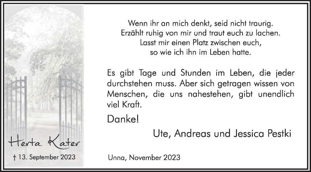 Hier finden Sie alle Traueranzeigen aus der Zeitung, die bisher für Herta Kater erschienen sind. Weitere Traueranzeigen, die in der Zeitung erscheinen, werden hier ebenfalls aufgelistet