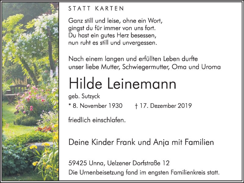 Hier finden Sie alle Traueranzeigen aus der Zeitung, die bisher für Hilde Leinemann erschienen sind. Weitere Traueranzeigen, die in der Zeitung erscheinen, werden hier ebenfalls aufgelistet