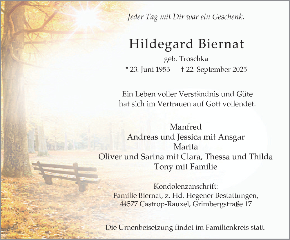Hier finden Sie alle Traueranzeigen aus der Zeitung, die bisher für Hildegard Biernat erschienen sind. Weitere Traueranzeigen, die in der Zeitung erscheinen, werden hier ebenfalls aufgelistet