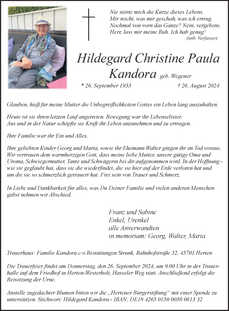Hier finden Sie alle Traueranzeigen aus der Zeitung, die bisher für Hildegard Christine Paula Kandora erschienen sind. Weitere Traueranzeigen, die in der Zeitung erscheinen, werden hier ebenfalls aufgelistet
