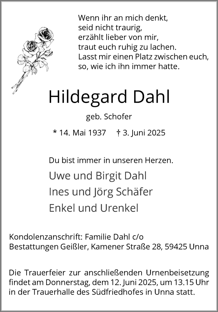 Hier finden Sie alle Traueranzeigen aus der Zeitung, die bisher für Hildegard Dahl erschienen sind. Weitere Traueranzeigen, die in der Zeitung erscheinen, werden hier ebenfalls aufgelistet