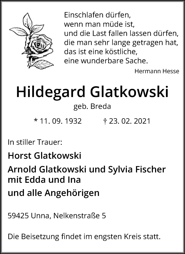 Hier finden Sie alle Traueranzeigen aus der Zeitung, die bisher für Hildegard Glatkowski erschienen sind. Weitere Traueranzeigen, die in der Zeitung erscheinen, werden hier ebenfalls aufgelistet