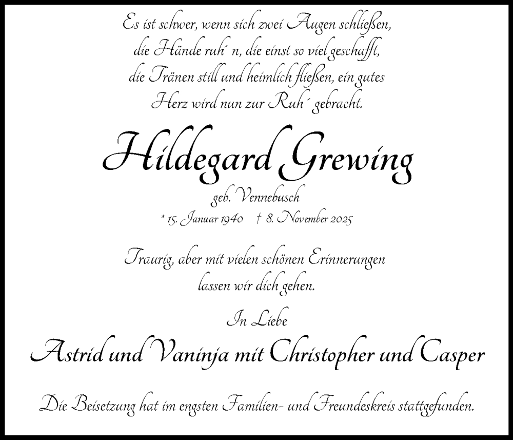 Hier finden Sie alle Traueranzeigen aus der Zeitung, die bisher für Hildegard Grewing erschienen sind. Weitere Traueranzeigen, die in der Zeitung erscheinen, werden hier ebenfalls aufgelistet