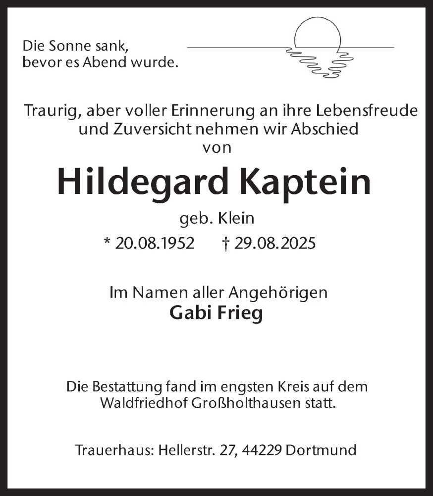 Hier finden Sie alle Traueranzeigen aus der Zeitung, die bisher für Hildegard Kaptein erschienen sind. Weitere Traueranzeigen, die in der Zeitung erscheinen, werden hier ebenfalls aufgelistet