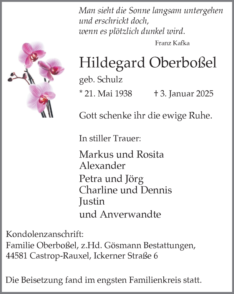 Hier finden Sie alle Traueranzeigen aus der Zeitung, die bisher für Hildegard Oberboßel erschienen sind. Weitere Traueranzeigen, die in der Zeitung erscheinen, werden hier ebenfalls aufgelistet