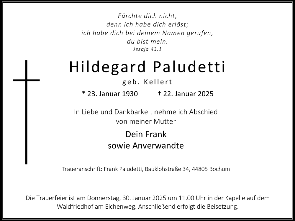 Hier finden Sie alle Traueranzeigen aus der Zeitung, die bisher für Hildegard Paludetti erschienen sind. Weitere Traueranzeigen, die in der Zeitung erscheinen, werden hier ebenfalls aufgelistet