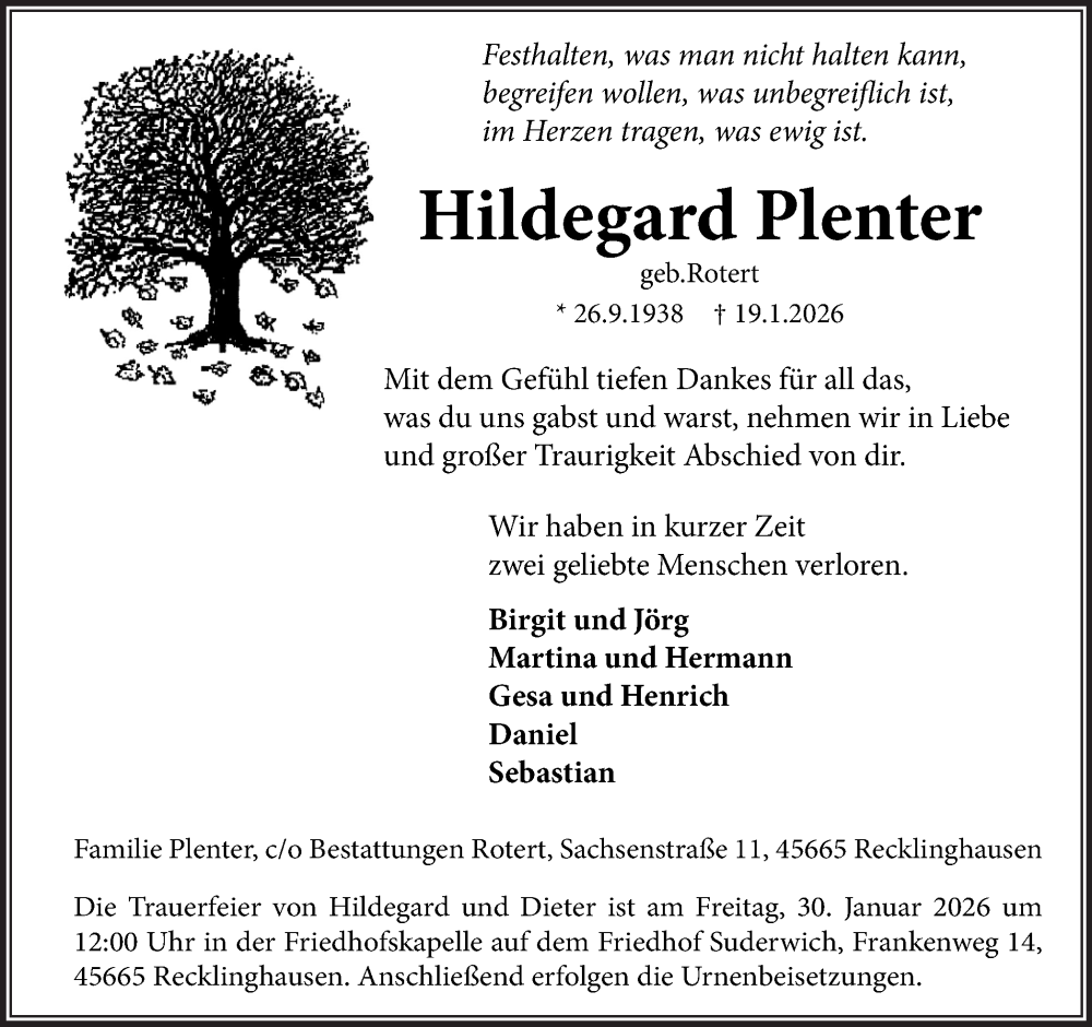 Hier finden Sie alle Traueranzeigen aus der Zeitung, die bisher für Hildegard Plenter erschienen sind. Weitere Traueranzeigen, die in der Zeitung erscheinen, werden hier ebenfalls aufgelistet