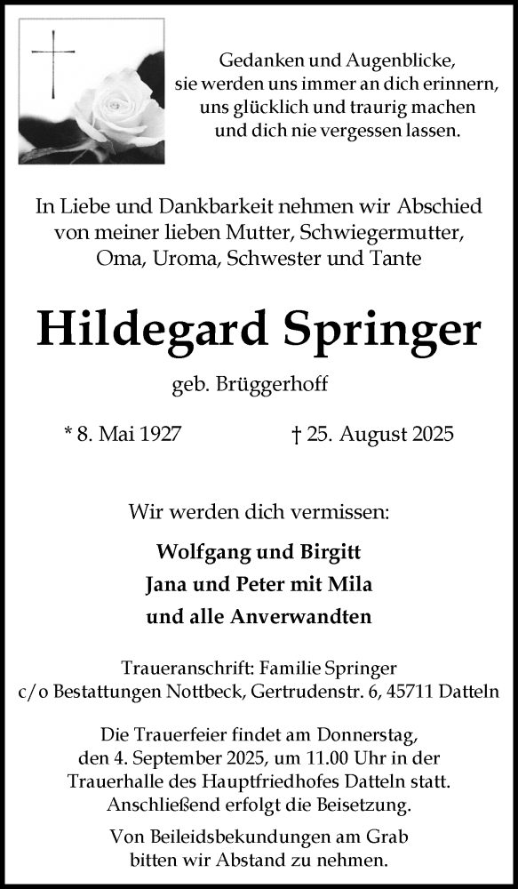 Hier finden Sie alle Traueranzeigen aus der Zeitung, die bisher für Hildegard Springer erschienen sind. Weitere Traueranzeigen, die in der Zeitung erscheinen, werden hier ebenfalls aufgelistet