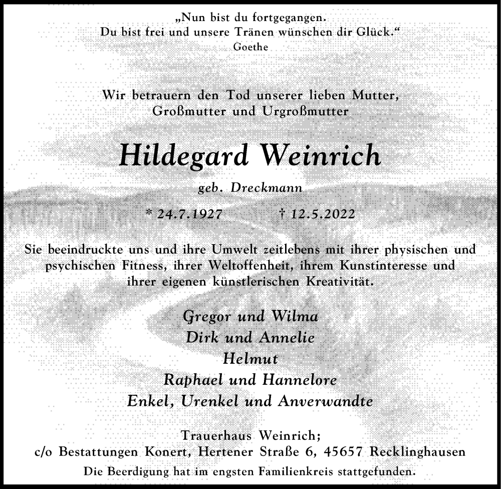 Hier finden Sie alle Traueranzeigen aus der Zeitung, die bisher für Hildegard Weinrich erschienen sind. Weitere Traueranzeigen, die in der Zeitung erscheinen, werden hier ebenfalls aufgelistet