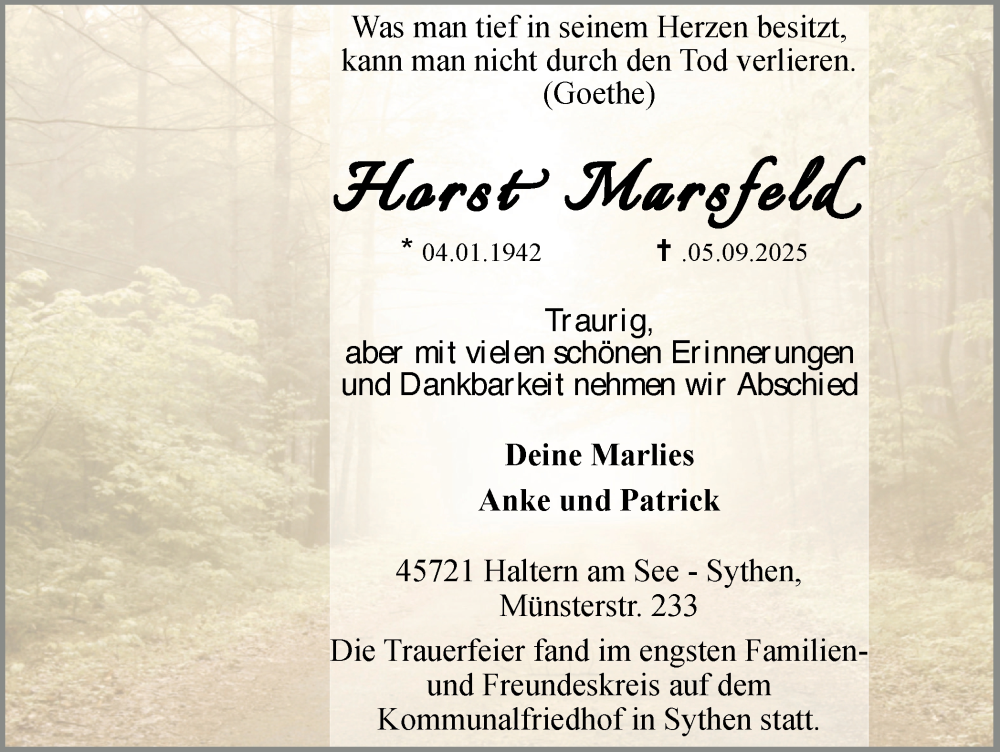 Hier finden Sie alle Traueranzeigen aus der Zeitung, die bisher für Horst Marsfeld erschienen sind. Weitere Traueranzeigen, die in der Zeitung erscheinen, werden hier ebenfalls aufgelistet