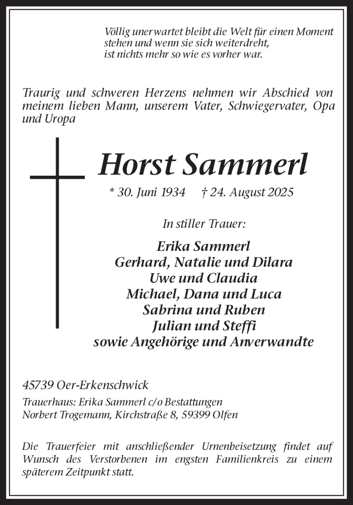 Hier finden Sie alle Traueranzeigen aus der Zeitung, die bisher für Horst Sammerl erschienen sind. Weitere Traueranzeigen, die in der Zeitung erscheinen, werden hier ebenfalls aufgelistet
