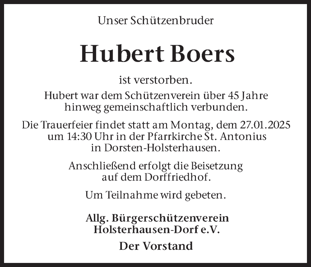 Hier finden Sie alle Traueranzeigen aus der Zeitung, die bisher für Hubert Boers erschienen sind. Weitere Traueranzeigen, die in der Zeitung erscheinen, werden hier ebenfalls aufgelistet