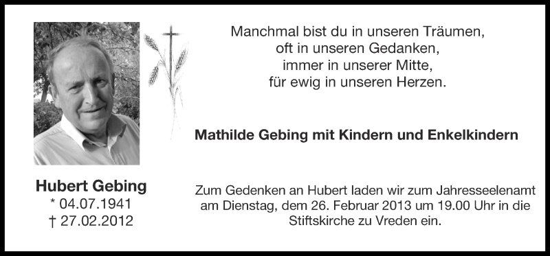 Hier finden Sie alle Traueranzeigen aus der Zeitung, die bisher für Hubert Gebing erschienen sind. Weitere Traueranzeigen, die in der Zeitung erscheinen, werden hier ebenfalls aufgelistet