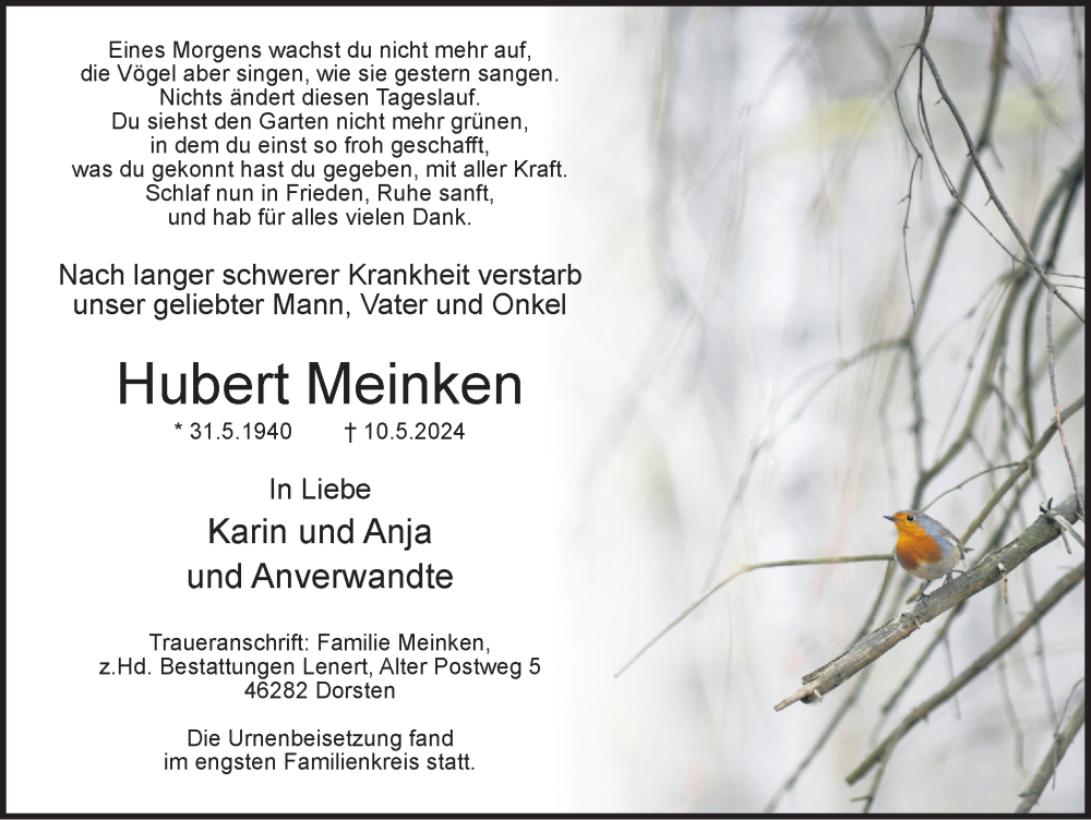 Hier finden Sie alle Traueranzeigen aus der Zeitung, die bisher für Hubert Meinken erschienen sind. Weitere Traueranzeigen, die in der Zeitung erscheinen, werden hier ebenfalls aufgelistet